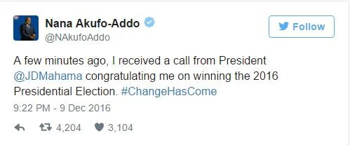 Akufo-Addo said on Twitter that Mahama called him congratulating him on winning the 2016 presidential election.