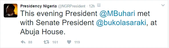 This evening President @MBuhari met with Senate President @bukolasaraki, at Abuja House.— Presidency Nigeria (@NGRPresident) February 19, 2017