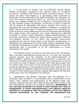 The Nigerian government in its formal rejection of the 2015/2016 annual report of Amnesty International, AI, which accused the country’s security and military forces of “extreme” human rights abuses declared the Shiite Islamic Movement of Nigeria, IMN, a security threat and compared it to the Boko Haram whose insurgency has caused the death of about 100,000 people since 2009.